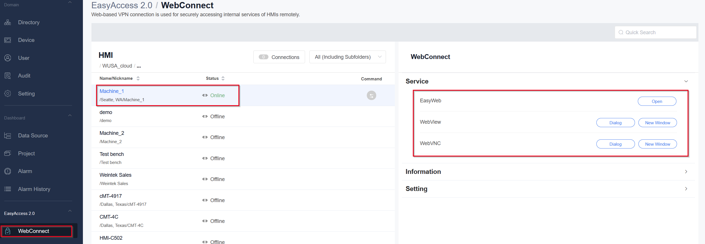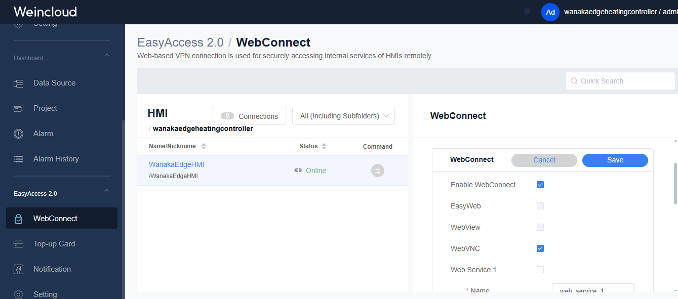 Within Weincloud when you navigate to the WebConnect tab are you able to select EasyWeb, Webview, or WebVNC to access your HMI? This should allow access to your HMI through Weincloud.