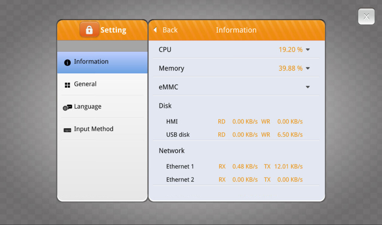 The read and write speed likely depends on system load, but it may be visible within the “System metrics” of your HMI’s settings menu: