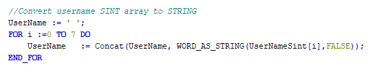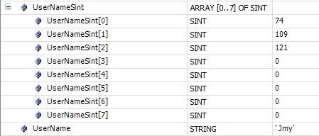 Here’s how I’m doing the conversion in the PLC code. This should work fine, but I’d expect the first 5 elements of that SINT array to be populated instead of just 3 when logged in as Jimmy.