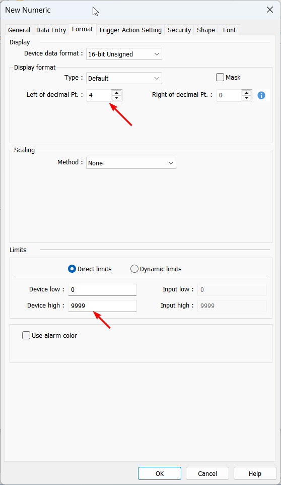 When the numeric object displays ****, this means that the value is to large to be displayed by the number of digits the object will display. To fix this, please increase the number of digits and set an appropriate “Device high” within the “Format” tab: