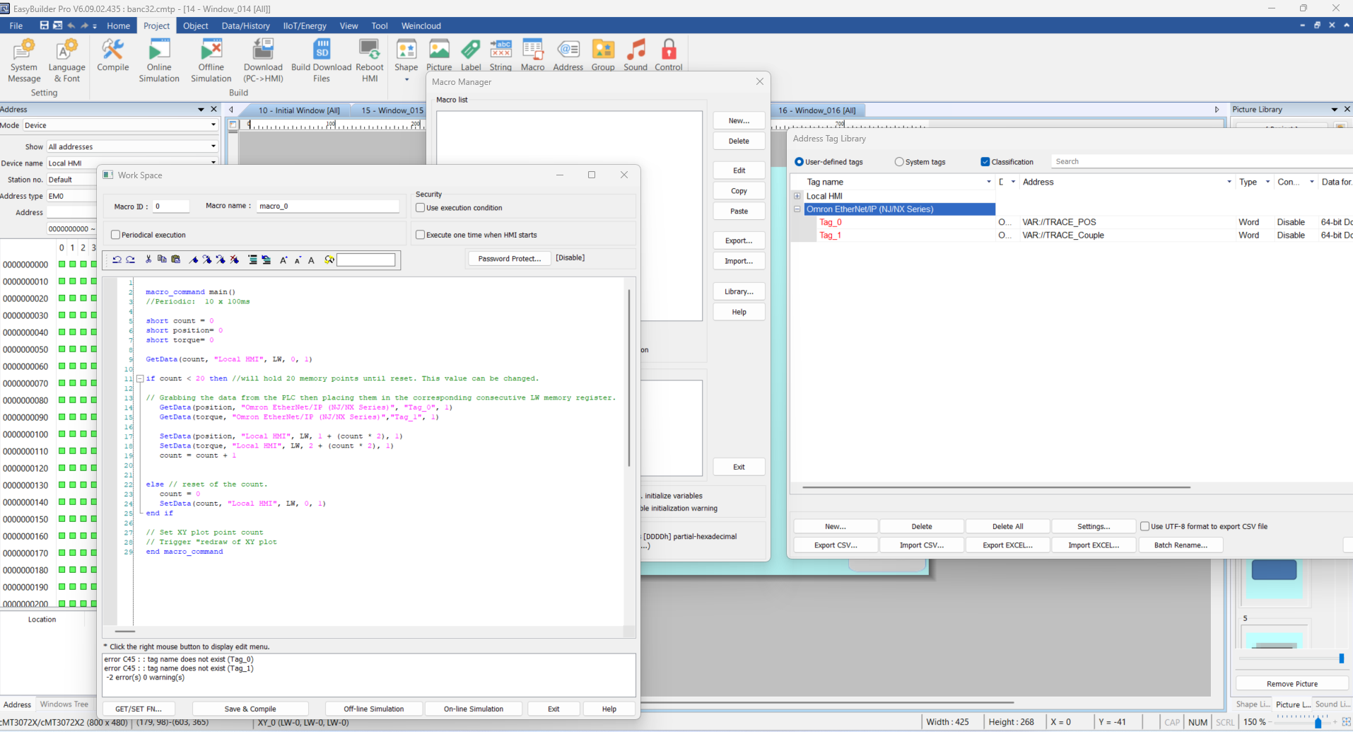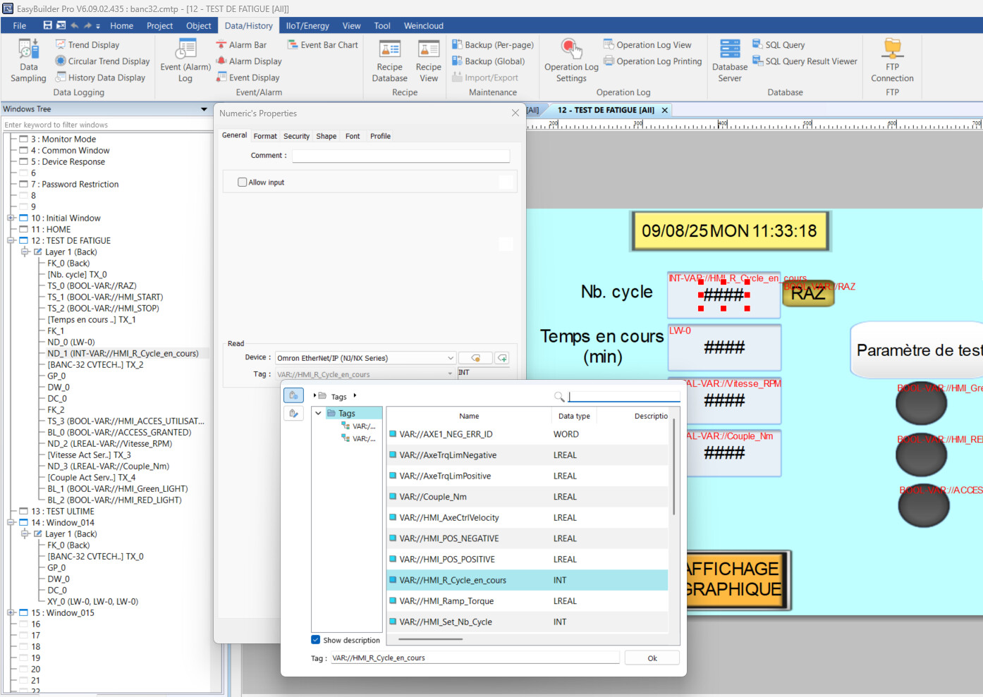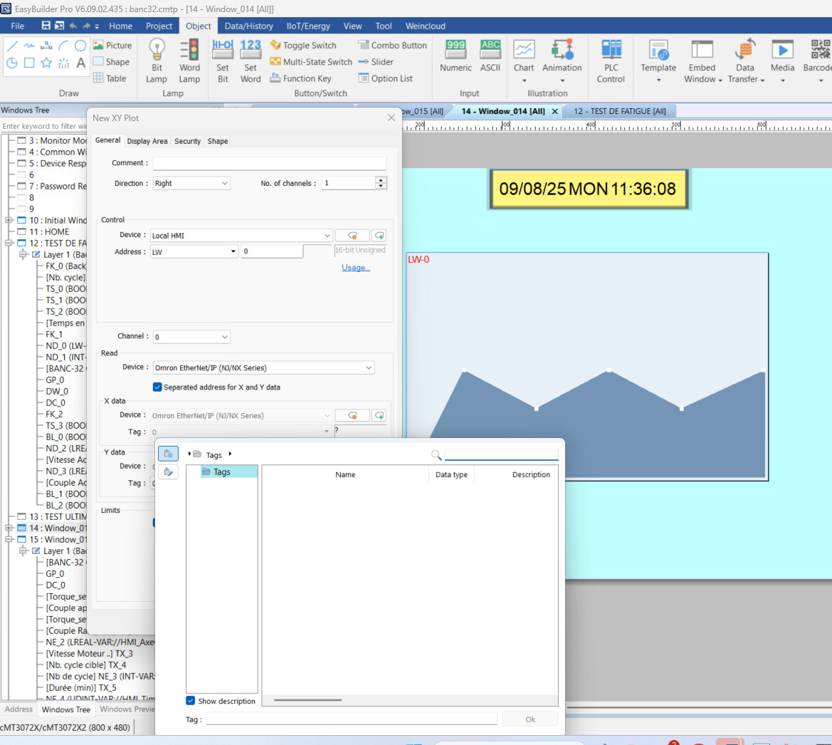 I’m using Weintek hmi with OMRON, i imported all tags and created what in want but something is missing. I would like to acquire the torque in function of the position, i have the variable of position and the torque both are Real data type but when i go under object, chart and select XY Plot, i separated X(position) and Y(Torque). But when i go to select select tag appropriate to the axis, there is no tags .