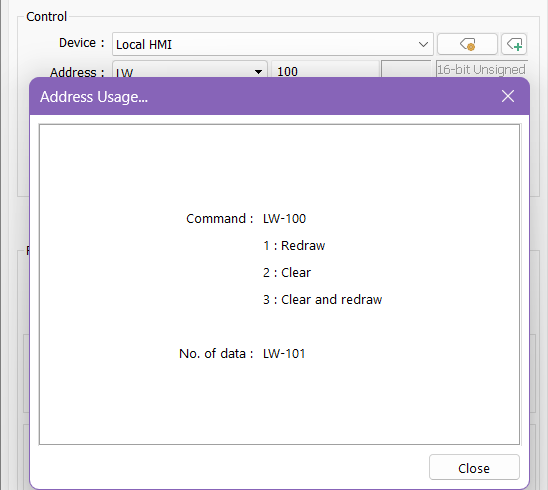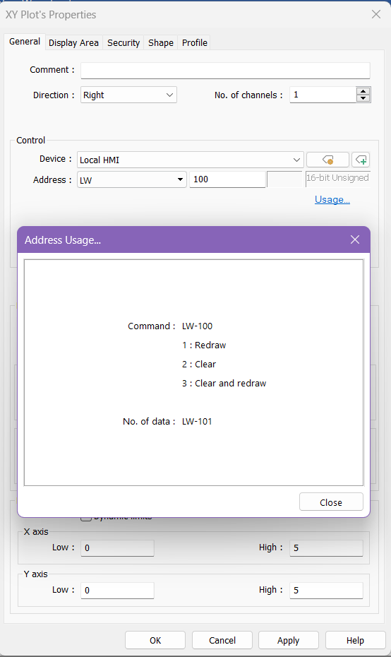 Below, I made a minor change to the macro. We need the values to be consecutive; therefore, the macro now allows the torque values to be placed from LW 1–3 and the position values from LW 4–6. Then, within the XY plot, I set the X data to start at LW 1 and the Y data to start at LW 4. Now, I can use the control address at LW 100 to draw and erase the plot. Note that the sequential address at LW 101 is used to determine how many points to draw on the plot.