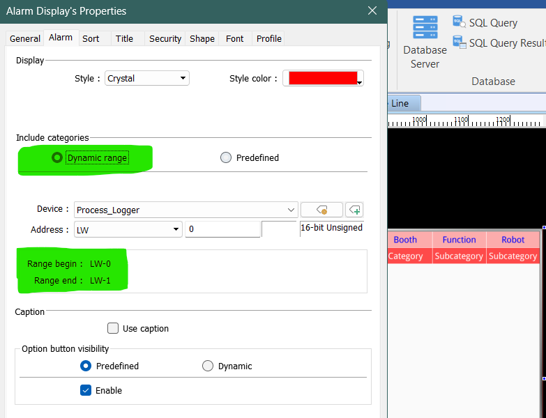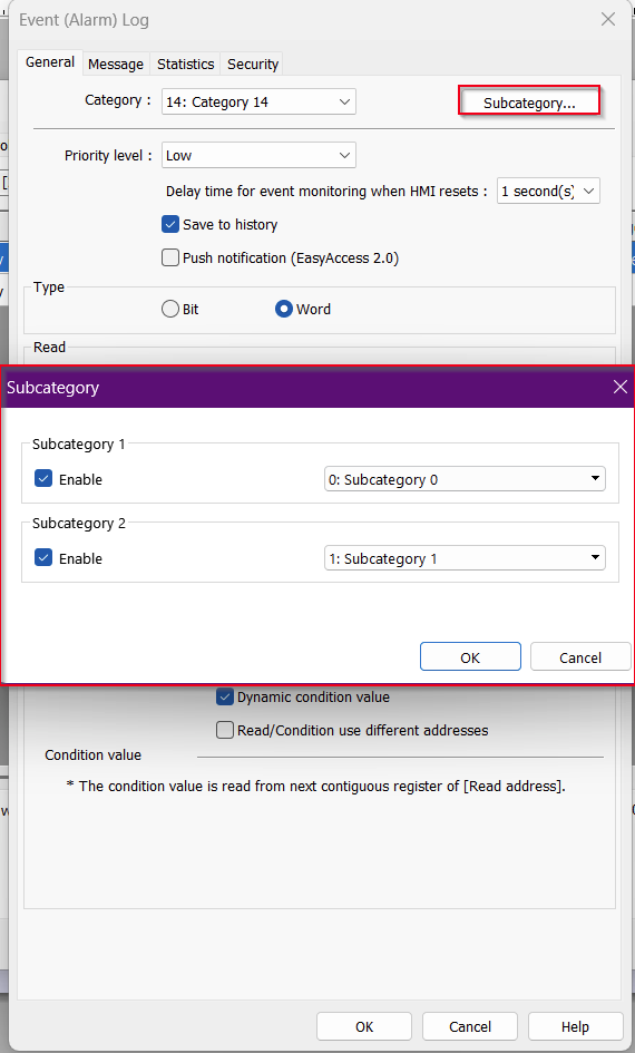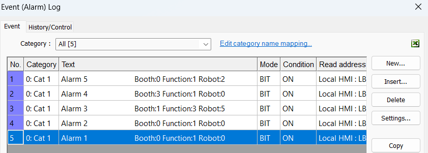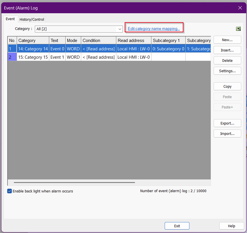 For more information on event alarms and categories please refer to section 7.2.2 of our Easy Builder Pro Manual..