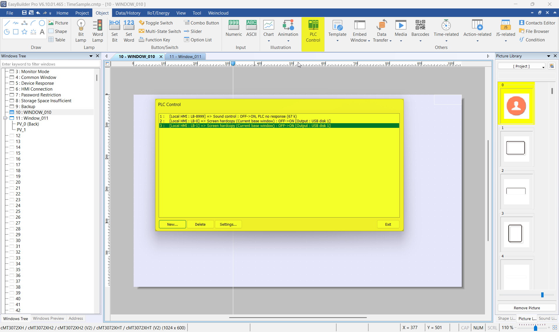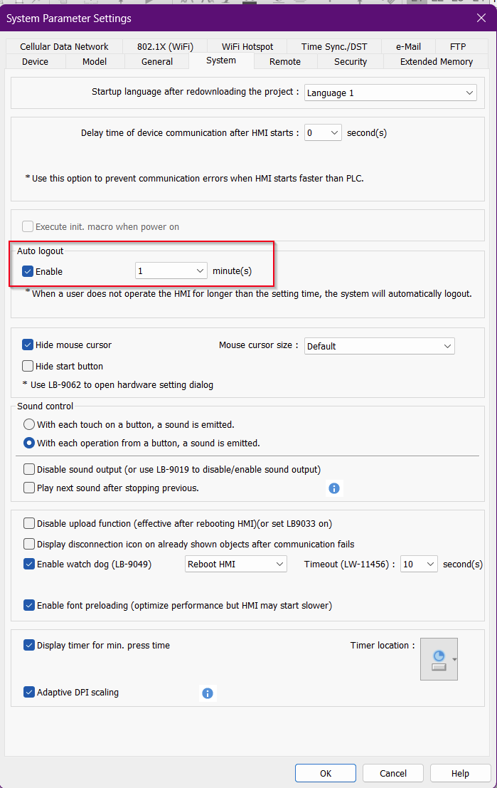 In the macro below, a counter variable “i” increments each second the user is on the login page and not interacting with the screen. When the count reaches MAX_TIME, which is set to 30 seconds initially, the PLC Control command at LW-0 changes the project window to the screen saver (window 80).