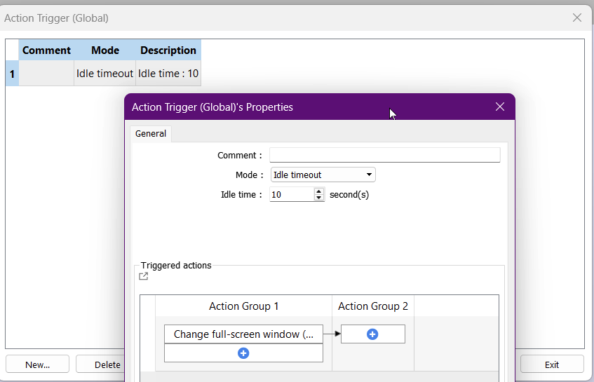 A Global Action Trigger is also used to reset the count if the user touches the screen to ensure idle functionality.