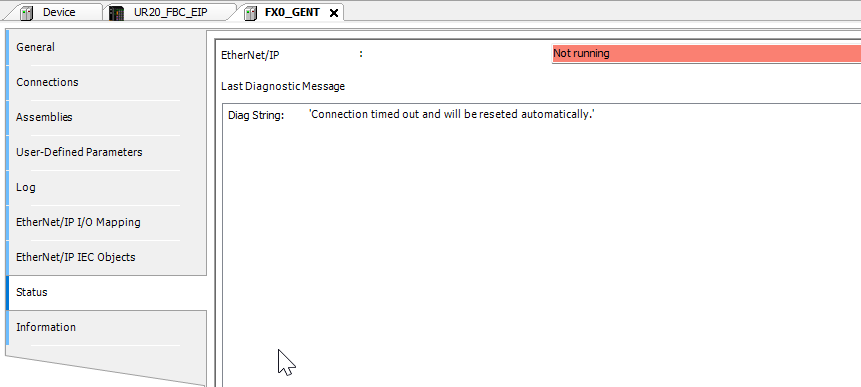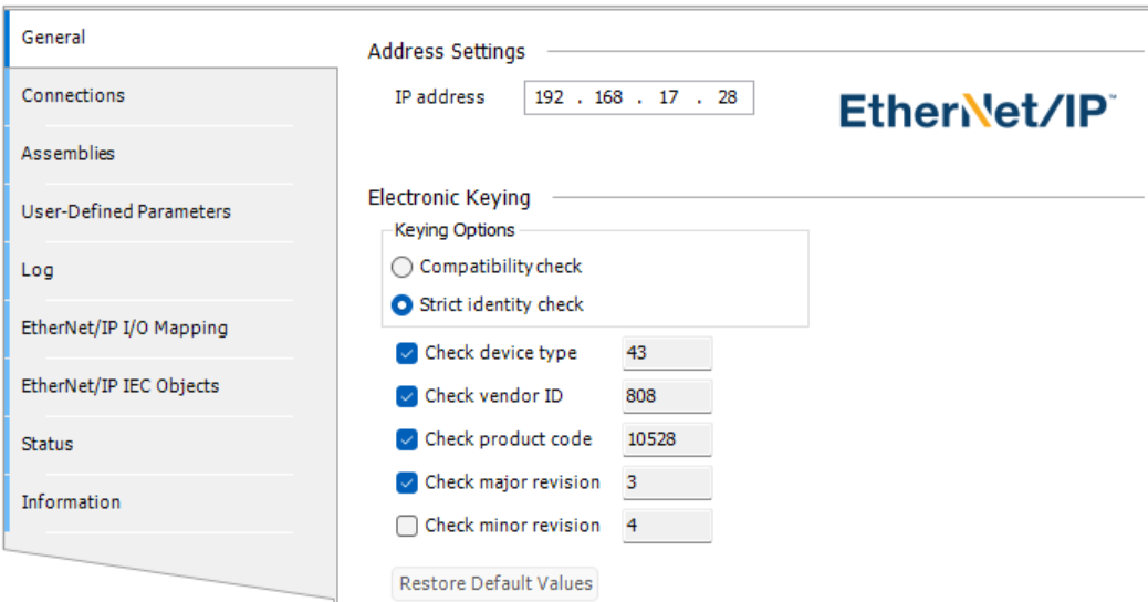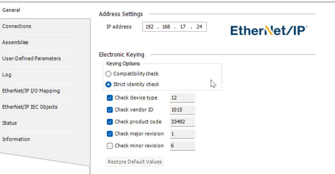 The Ethernet/IP driver being unable to reconnect may be related to an issue with electronic keying. Can you also post a screenshot that shows how you’ve configured the key values within your Ethernet IP slave settings?