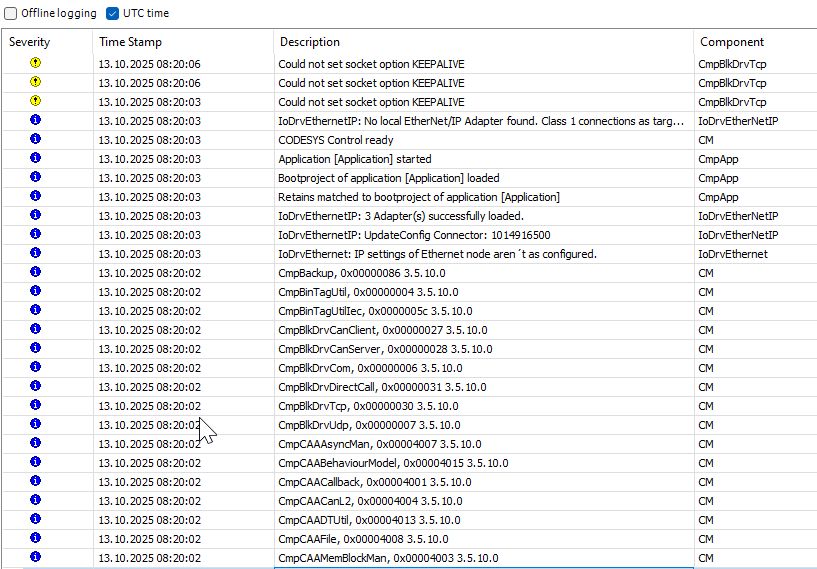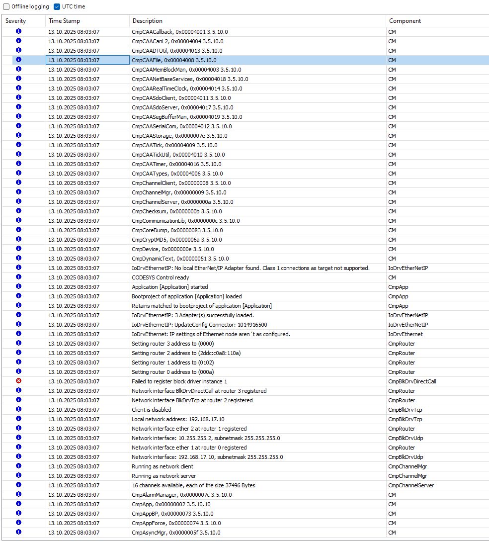 I just tested putting a dumb switch instead of a router and Codesys established all connections and has not faulted after power UP. It also worked with switch OFF while HMI is powering UP and then powering switch – the connection is re-established and Codesys not faulting.