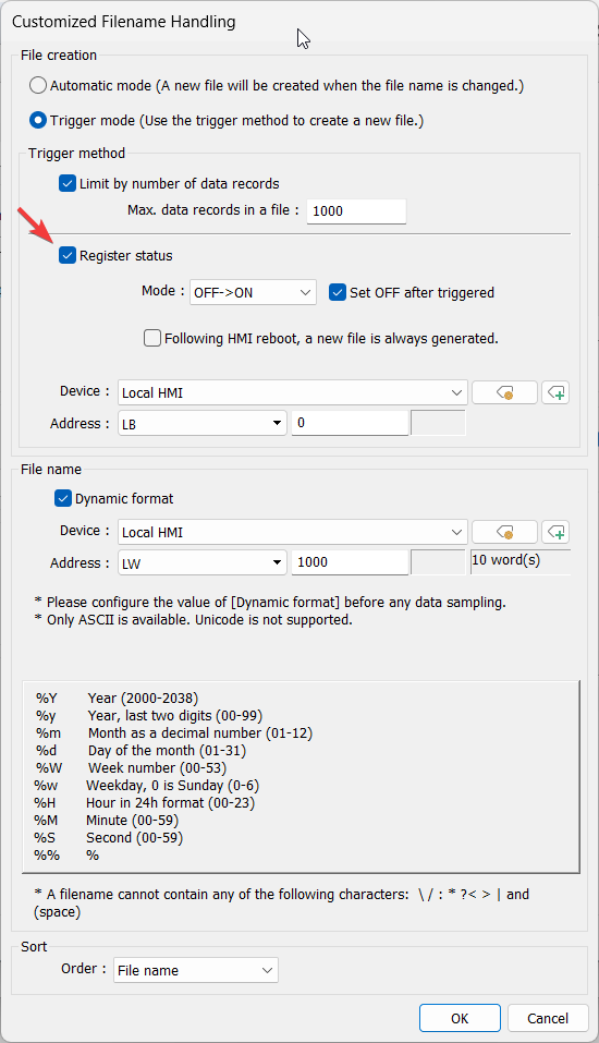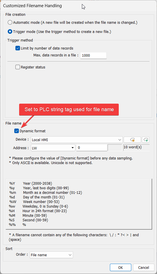 Thanks for the reply. That gets me close; but the file name isn’t working. Even with dynamic format selected the file name is whatever I enter into the “folder name” text box on the sampling setup screen.