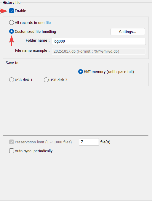 So I tested the project you sent as an online simulation and it worked. So I went back and deleted my logging and backup objects and recreated them to match the sample project, and they worked as an online simulation. When I download the project to the HMI and then FTP to the USB drive though it is right back to the previous state of always being a file name/data set behind.