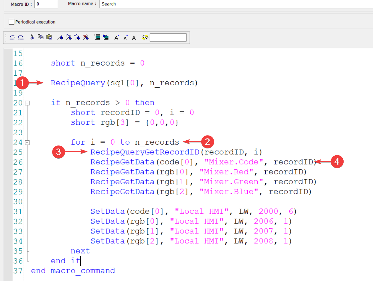 In your macro, you can move the RecipeQuery("SELECT * FROM ...", total_row) call outside of the for loop. RecipeQuery returns the number of records found and stores it in total_row.