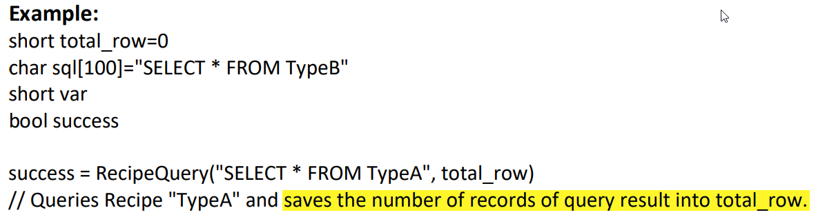 Within macros, the record “count” is returned when you invoke the RecipeQuery function, there is no need to select the count in your statement.