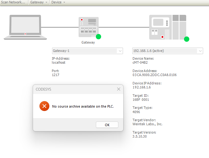 There was enough work lost that I wanted to just upload what’s on the device rather than re-do it. So in Codesys I clicked File → Source Upload, click on the only device seen, which is my Weintek HMI, and get the below message when trying to upload.