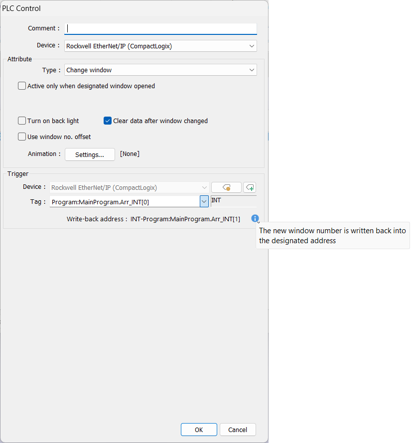 If the element is not part of an array it will not display as an option within this menu because a single integer tag cannot be used for both the trigger and write back address. However, a non-array tag can still be used if you first transfer the value within that tag into HMI memory, such as LW-0, and then read LW-0 + LW-1 using the “change window” option within this object.