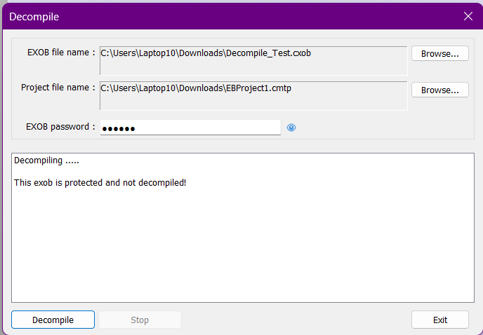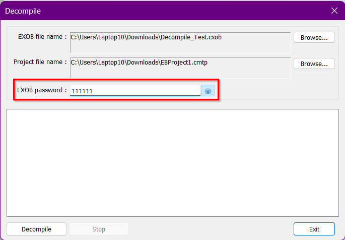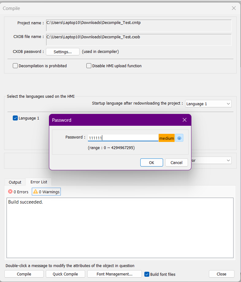 Within EasyBuilder Pro, passwords can be applied to EXOB/CXOB files during project compilation. When attempting to decompile the project file afterward, the correct password must be entered to successfully decompile the file back into an EXOB/CXOB file for editing.