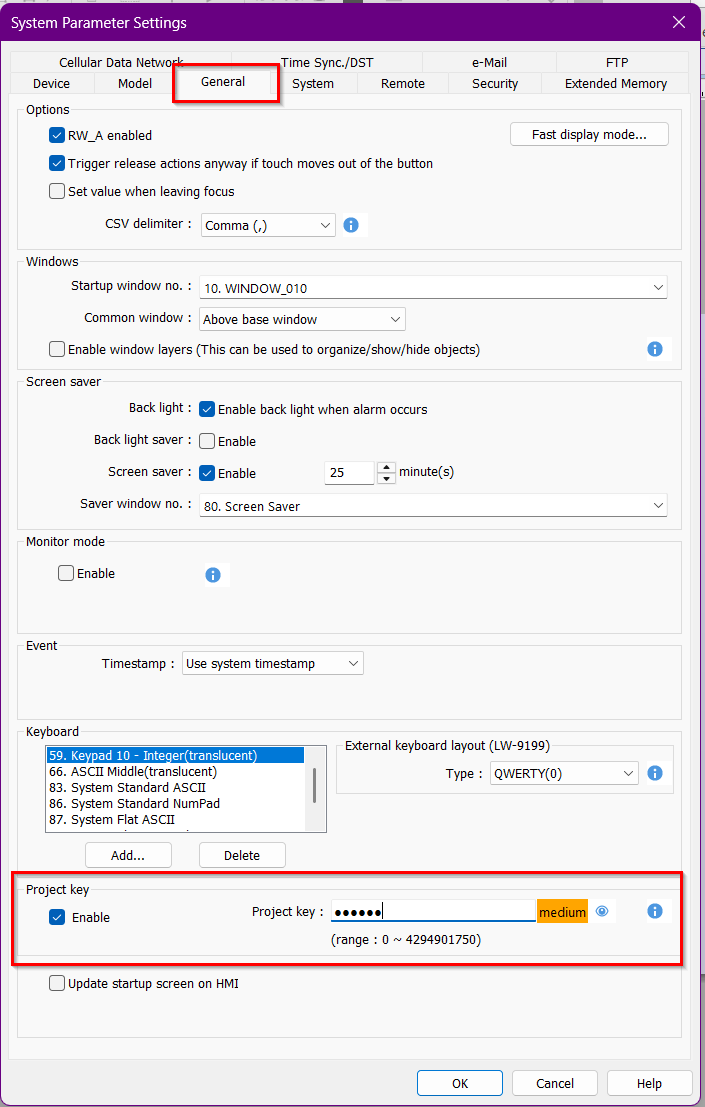 If you want your project to run only on specific HMIs and not others, setting up a project key within your EasyBuilder Pro project will accomplish this. The project key can be configured under System Parameter → General → Project Key.