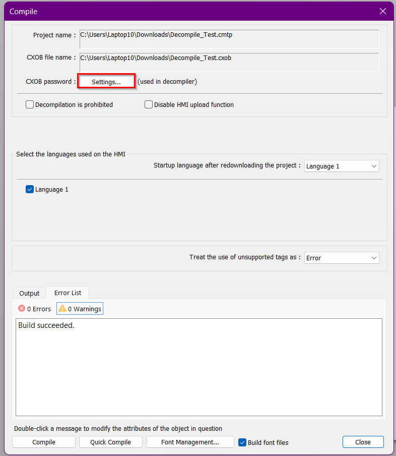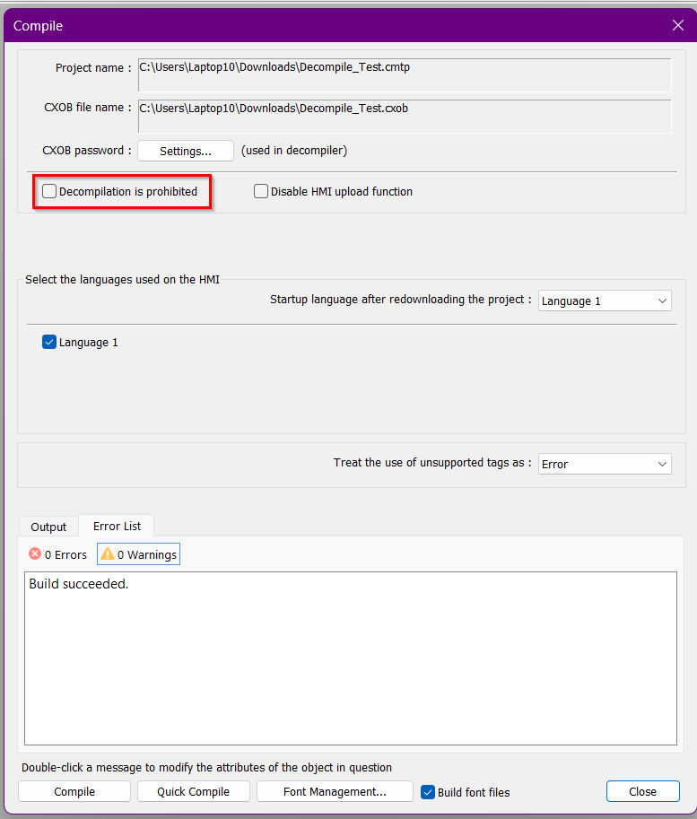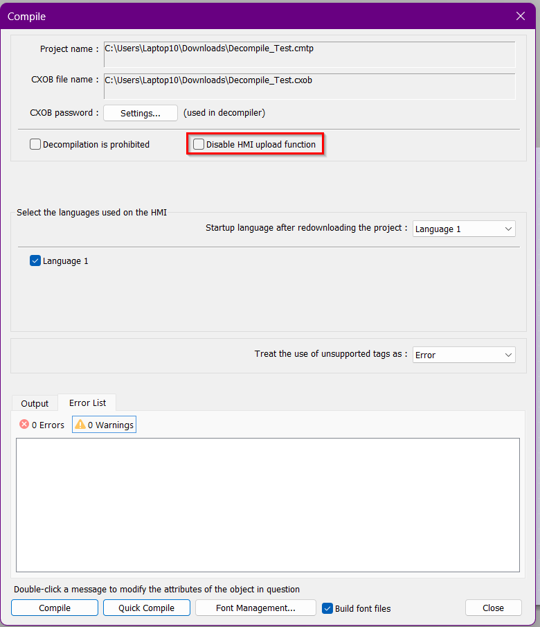 Project upload to an HMI can be disabled either within the compile settings or by using system register LB-9033. When project upload is disabled, any uploaded file will be 0 bytes and cannot be decompiled. The HMI will need to be rebooted for the setting changes to take effect.