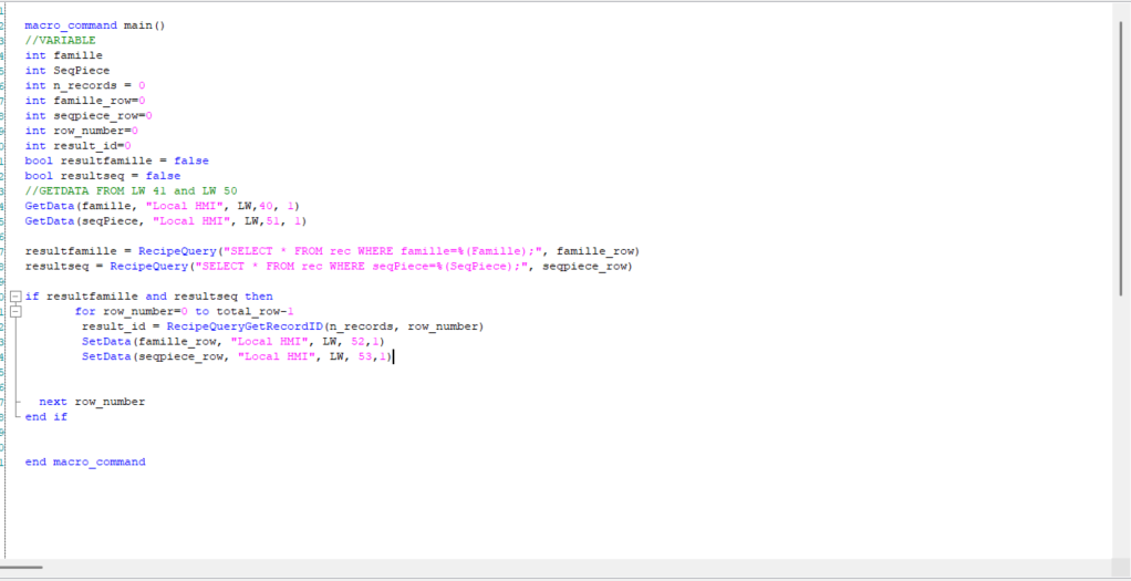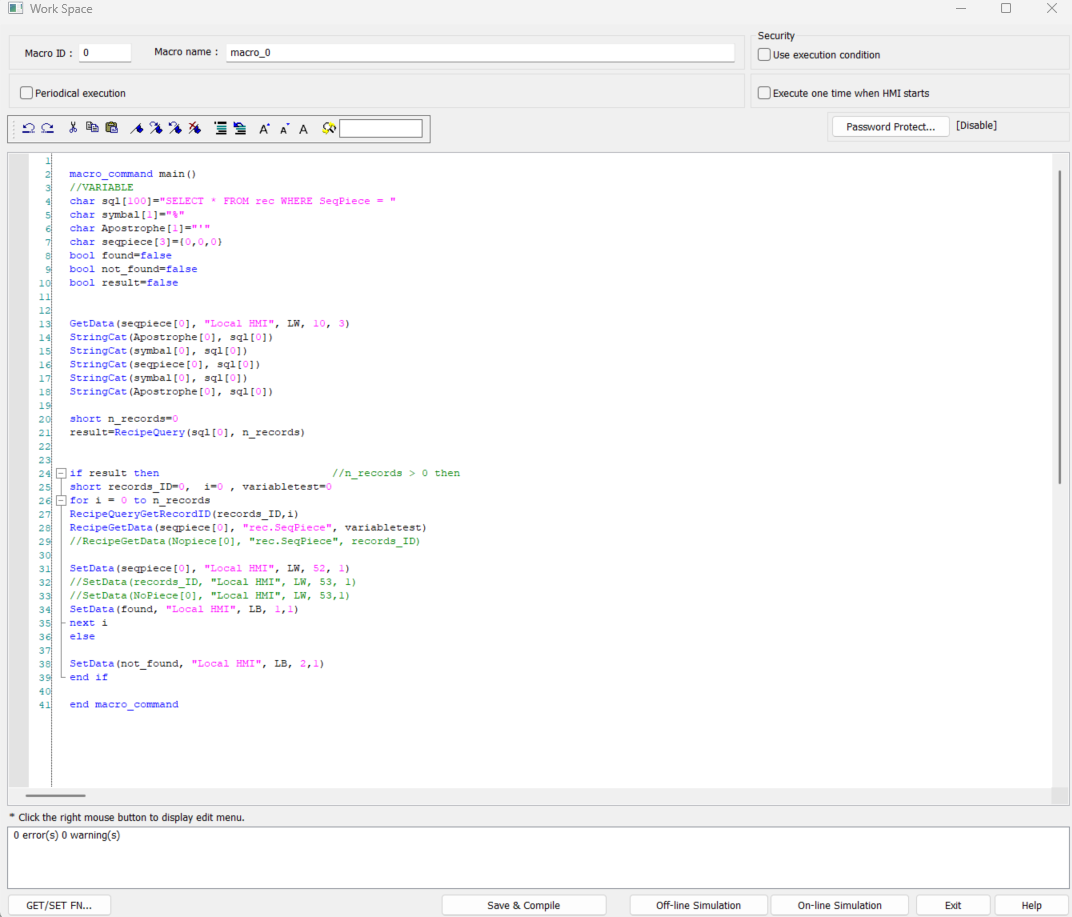 it’s the first that i work with a recipe i was able to create a recipe database and also import, export clear recipe everything right. now i want to use a macro to search data based on user input. the user for example will enter INPUT A an INPUT B then the macro should get the record of INPUT A and INPUT B and also output the value of C and D on the record of input A and INPUT B. SUpposed that my column on my recipe is A,B,C,D, user enter A and B and the macro should give C and D that match input of the user . here is what i did but seems not working input A is on LW41 and input B is on LW50. search button is only executing the macro also i want to print a text if A and B enterd by the user is existing on recipe.