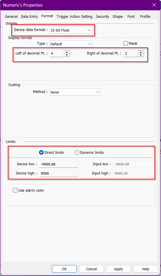 To obtain a negative float value, I placed a numeric object, selected 32-bit float as the device data format, set 2 digits (or more) to the right of the decimal point, and configured a negative value as the device low limit.