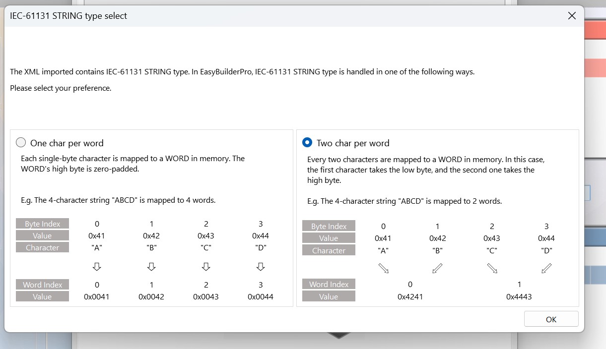 When I use a standard ASCII input to the same address in codesys, it works fine. I have tried both one character and two character per word formats when importing my tags. I’m not sure what I’m missing?