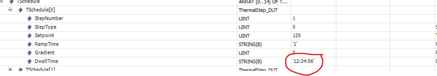 In CODESYS and other type-based PLCs, string data is stored in word-based memory, so when the macro tries to send character bytes without converting them into word format, only the first byte is interpreted correctly. This would explain why only the first character of the HH:MM:SS string appears in CODESYS after the transfer.