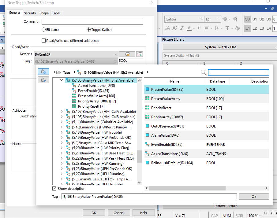 As shown, I have linked to a specific PLC tag and selected “present value ID#85” which implies HMI will read the Binary Value.