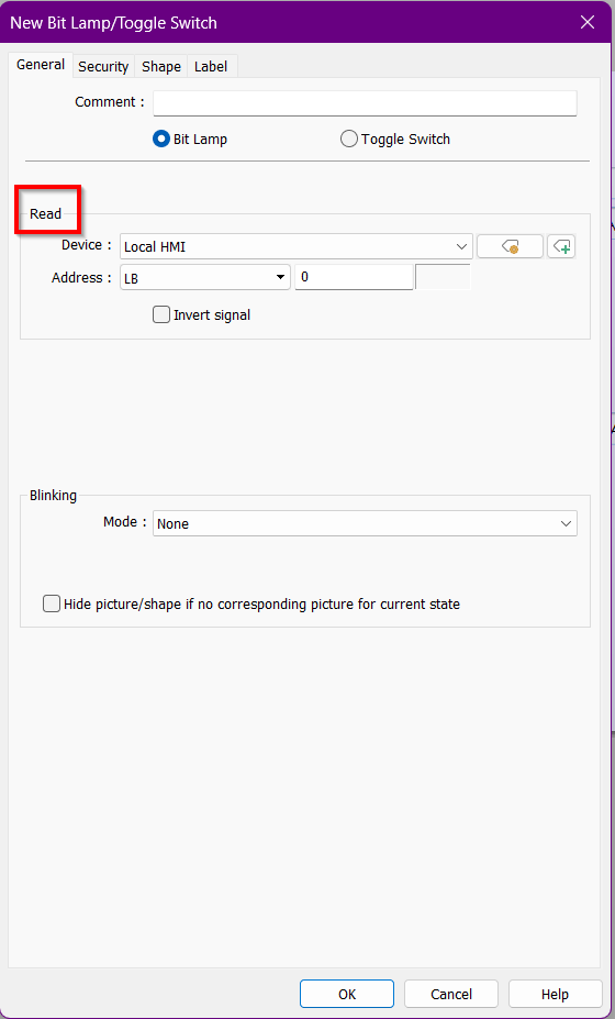 The memory address associated with the toggle switch allows both reading from and writing to that address through the toggle switch. If you want separate memory addresses for read and write within the toggle switch, please select the “Read/Write use different addresses” box. Each object within EB Pro lets you know whether it is a read, write, or read/write object in the General tab.